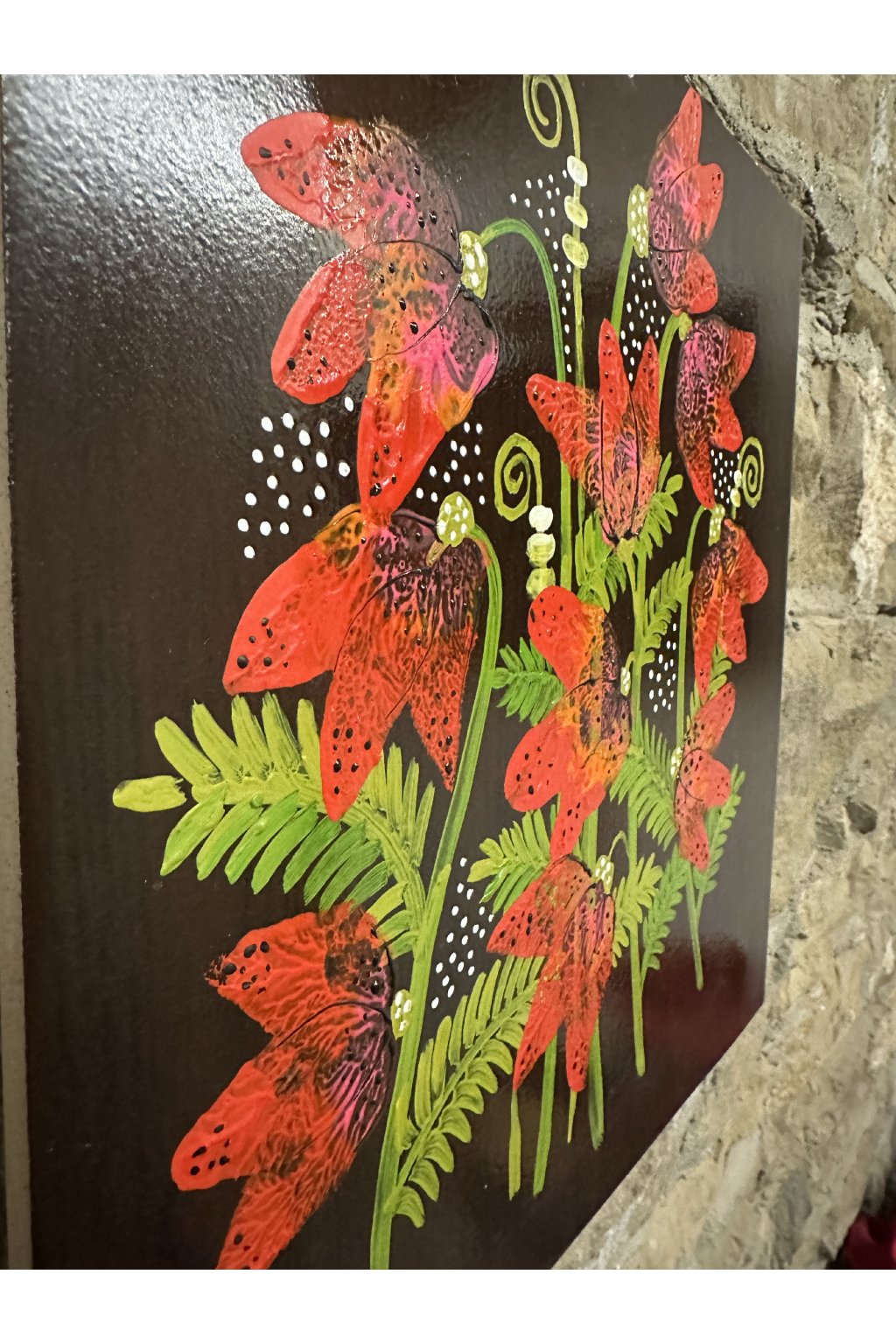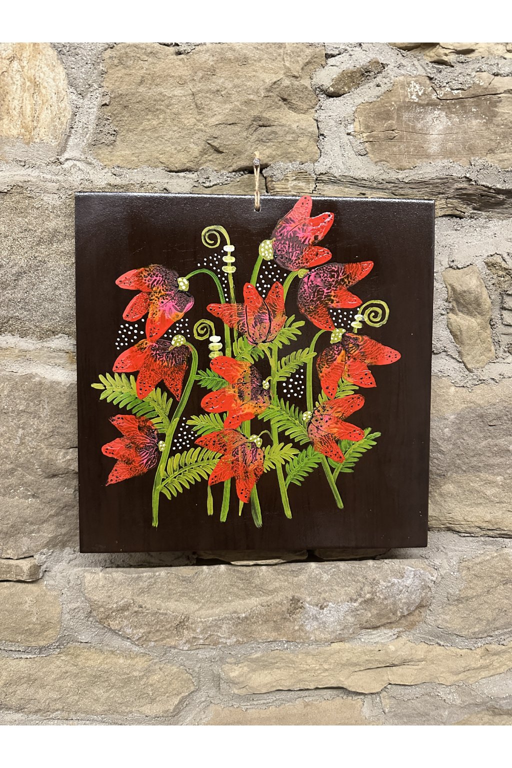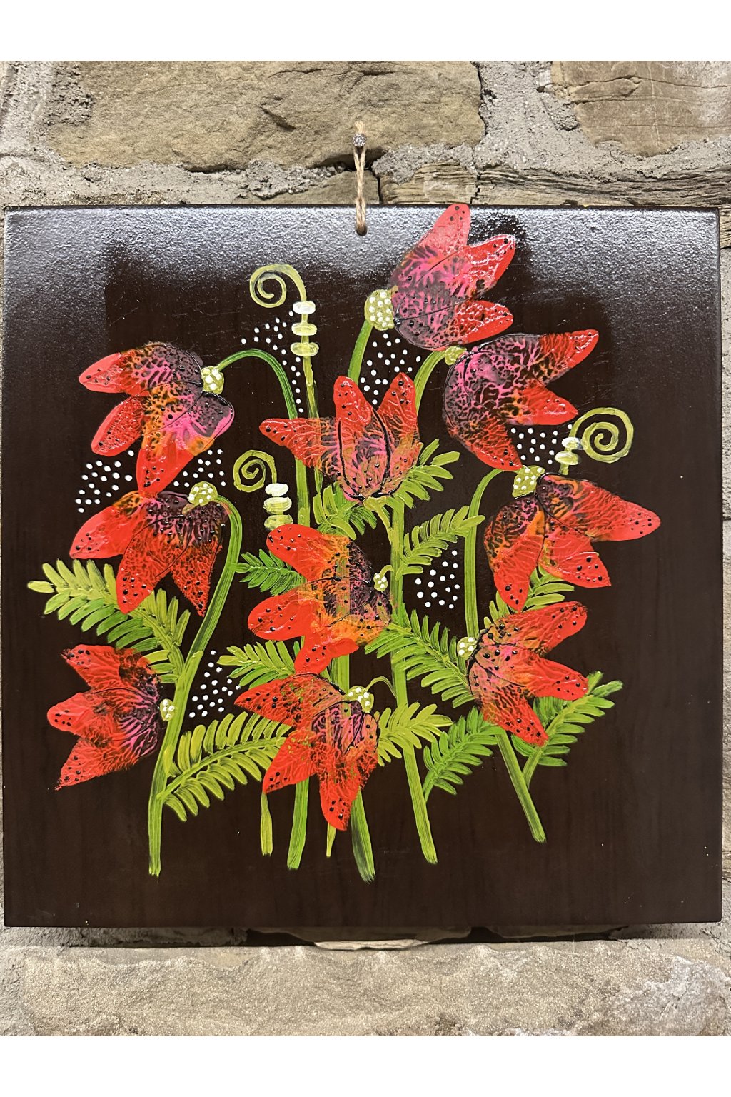 Ručně malovaná keramická dlaždice s motivem červených květů a zelených listů. Syté barvy v kombinaci s tmavým podkladem vytvářejí výraznou, ale přirozenou dekoraci. Dlaždice se hodí jako samostatný prvek do interiéru nebo jako součást květinové kolekce.