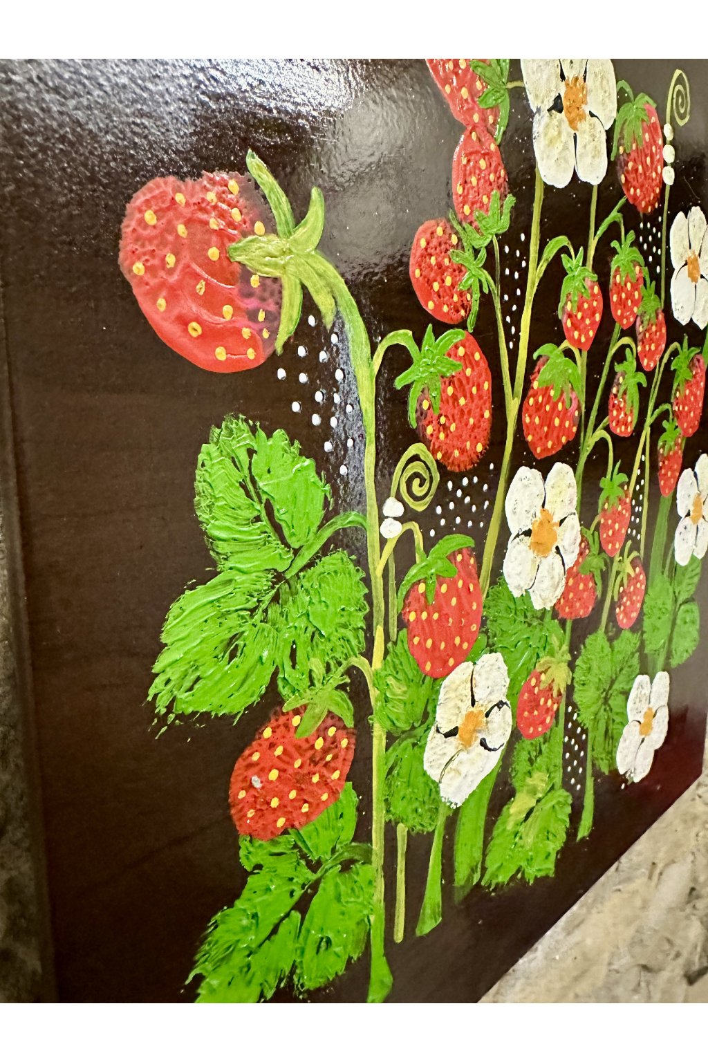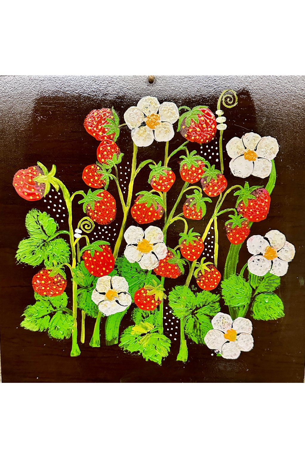 Ručně malovaná keramická dlaždice s motivem jahod a květů, vytvořená jako originální dekorace s venkovským nádechem.