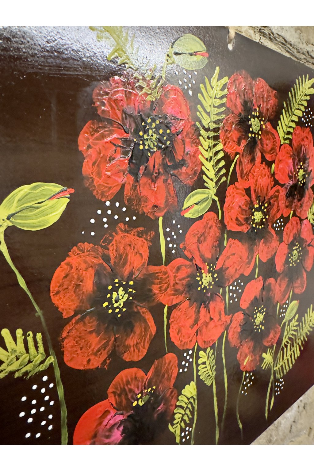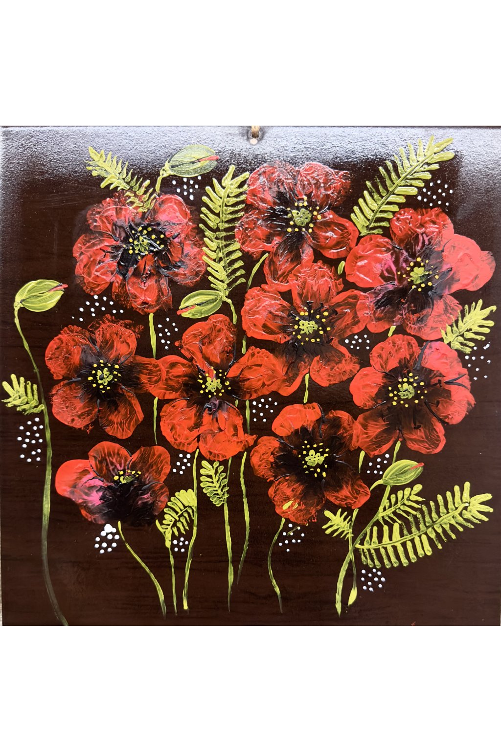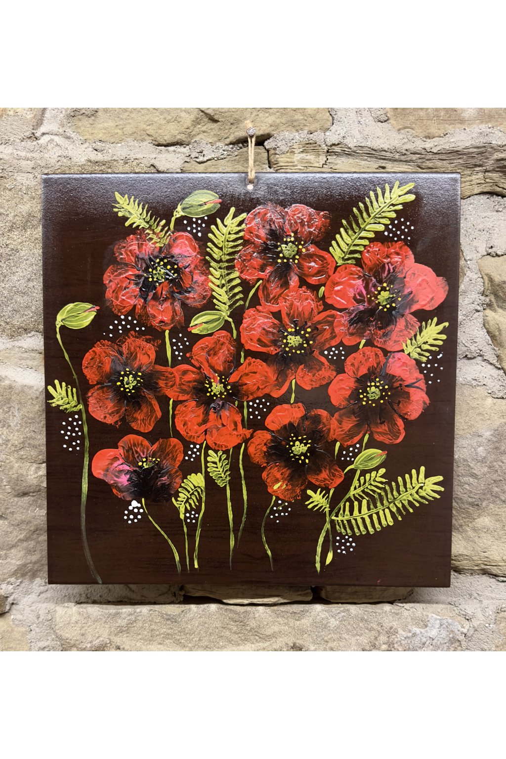 Ručně malovaná keramická dlaždice s motivem vlčích máků v sytých červených tónech. Každý květ je malovaný vrstvením barev, díky čemuž vzniká plastický a živý dojem. Dlaždice působí výrazně, ale přirozeně, a hodí se jako solitérní dekorace do interiéru.